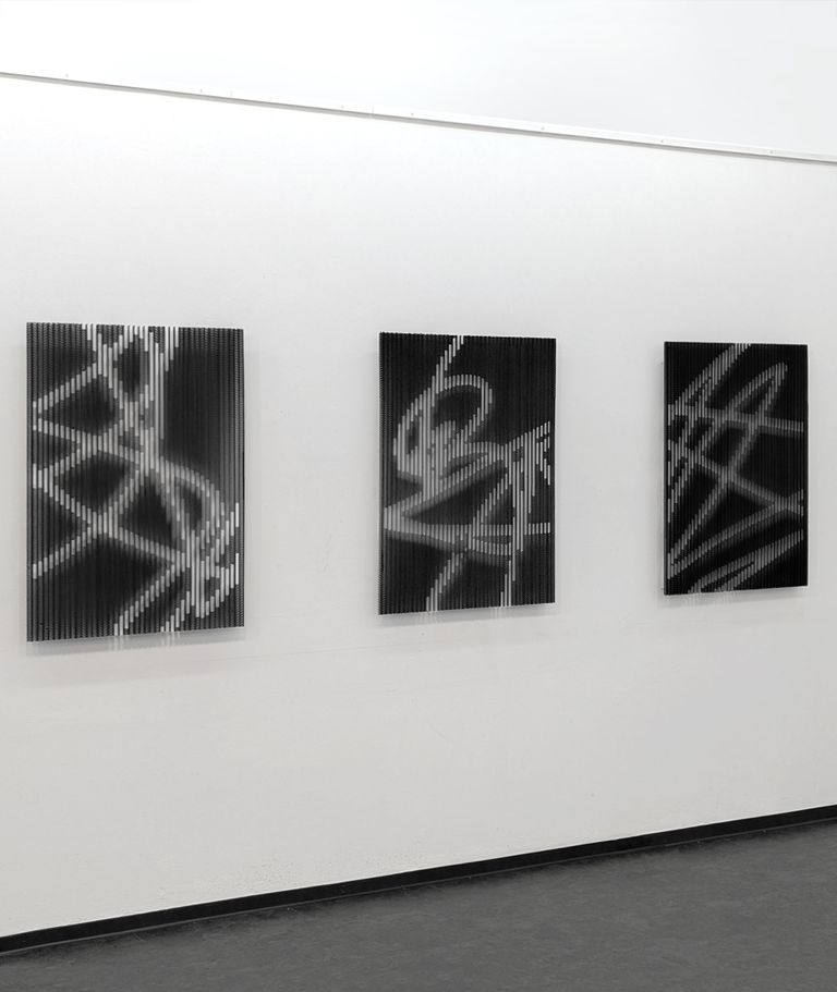 BESCHREIBUNG I, II, III, 2025, Wellpappe, Farbe, 70 x 100 cm